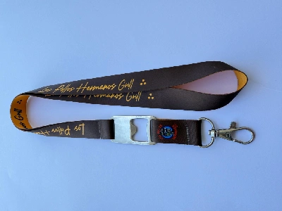 Lanyards sublimados (2 cm y 2.5 cm) con tip top, mosquetón giratorio, doble gancho y destapador,